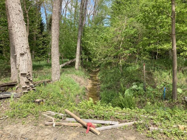 z návštěvnické infrastruktury, na zoufale zmateně zmeandrovaně utrápený potok.