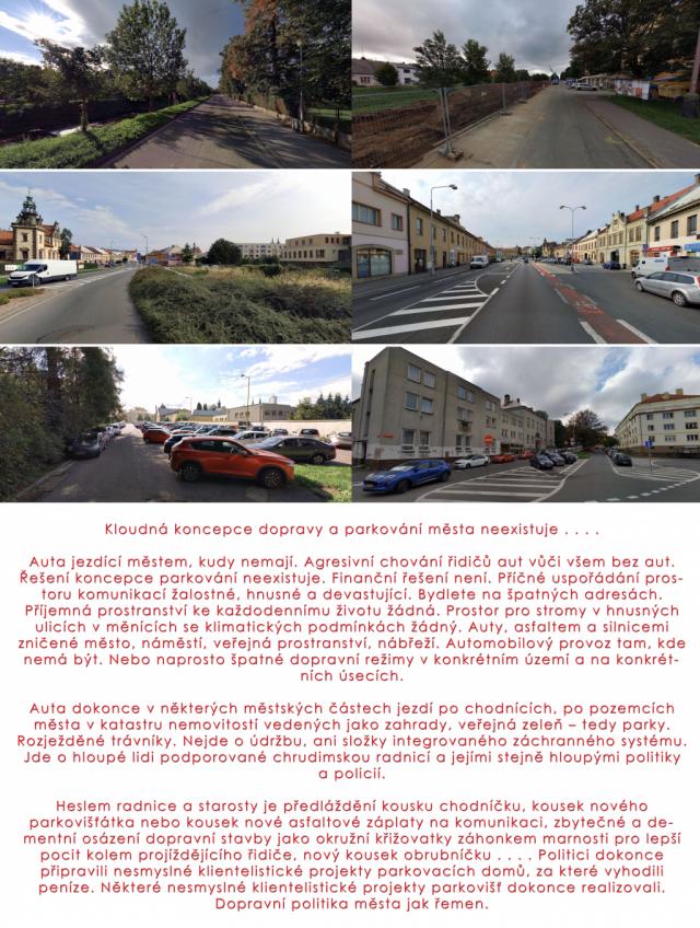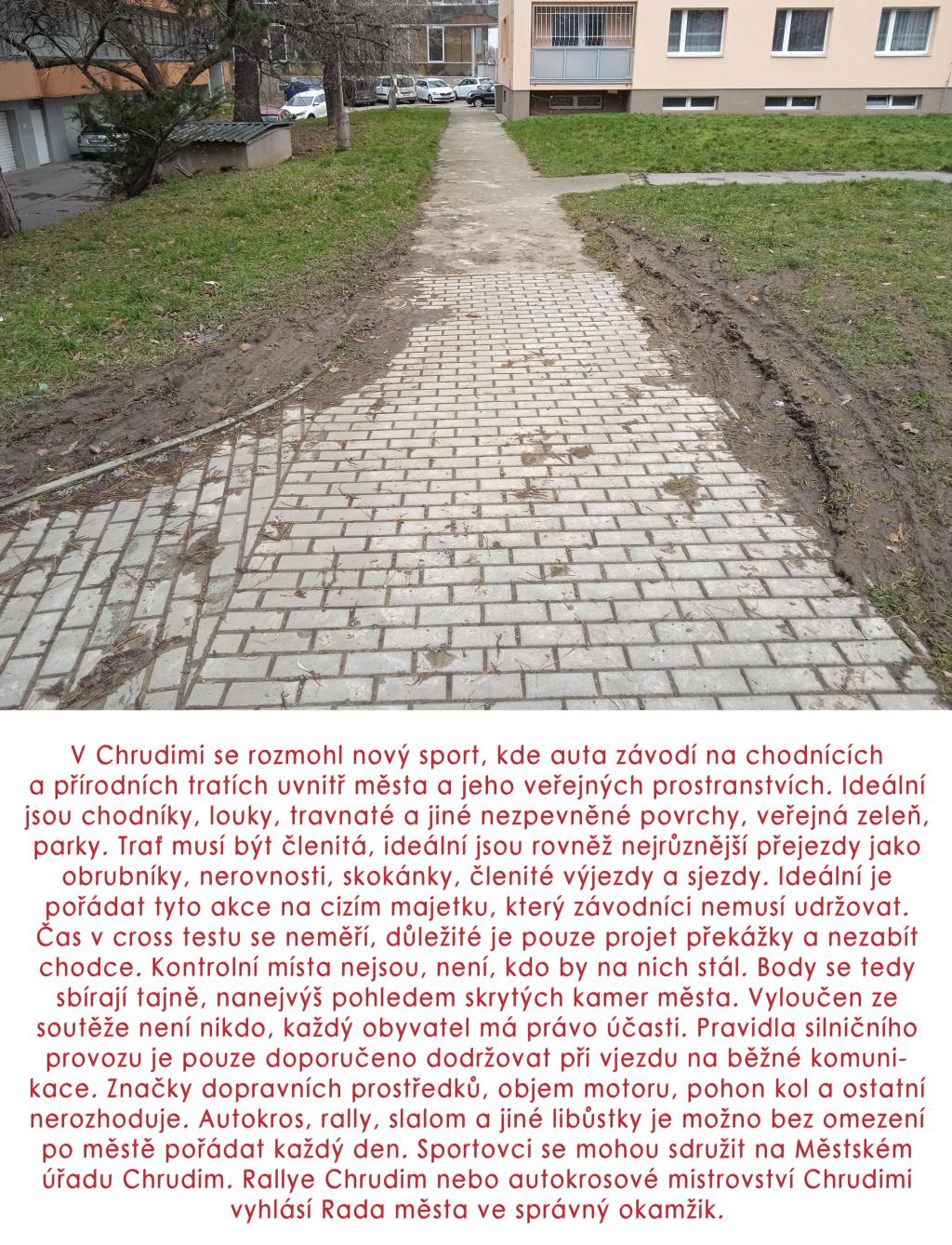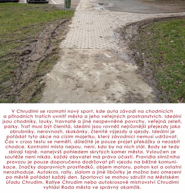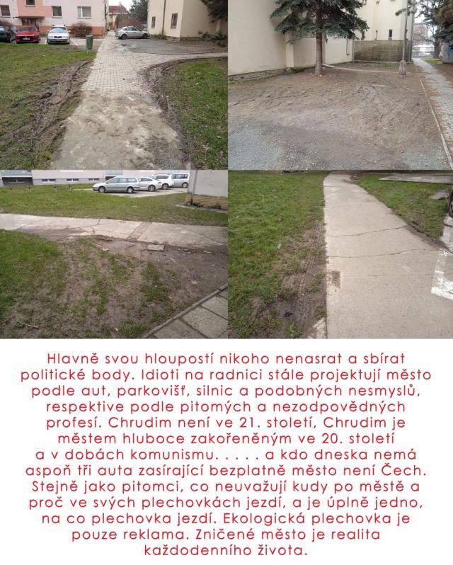 území a na konkrétních úsecích. Auta dokonce v některých městských částech jezdí po chodnících, po pozemcích města v katastru nemovitostí vedených jako zahrady, veřejná zeleň – tedy parky. Rozježděné trávníky. Nejde o údržbu, ani složky integrovaného záchranného systému. Jde o hloupé lidi podporované chrudimskou radnicí a jejími stejně hloupými politiky a policií. Heslem radnice a starosty je předláždění kousku chodníčku, kousek nového parkovišťátka nebo kousek nové asfaltové záplaty na komunikaci, zbytečné a dementní osázení dopravní stavby jako okružní křižovatky záhonkem marnosti pro lepší pocit kolem projíždějícího řidiče, nový kousek obrubníčku . . . . Politici dokonce připravili nesmyslné klientelistické projekty parkovacích domů, za které vyhodili peníze. Některé nesmyslné klientelistické projekty parkovišť dokonce realizovali. Dopravní politika města jak řemen. Hlavně svou hloupostí nikoho nenasrat a sbírat politické body. Idioti na radnici stále projektují město podle aut, parkovišť, silnic a podobných nesmyslů, respektive podle pitomých a nezodpovědných profesí. Chrudim není ve 21. století, Chrudim je městem hluboce zakořeněným ve 20. století a v dobách komunismu. . . . . a kdo dneska nemá aspoň tři auta zasírající bezplatně město není Čech. Stejně jako pitomci, co neuvažují kudy po městě a proč ve svých plechovkách jezdí, a je úplně jedno, na co plechovka jezdí. Ekologická plechovka je pouze reklama. Zničené město je realita každodenního života. V Chrudimi se rozmohl nový sport, kde auta závodí na chodnících a přírodních tratích uvnitř města a jeho veřejných prostranstvích. Ideální jsou chodníky, louky, travnaté a jiné nezpevněné povrchy, veřejná zeleň, parky. Trať musí být členitá, ideální jsou rovněž nejrůznější přejezdy jako obrubníky, nerovnosti, skokánky, členité výjezdy a sjezdy. Ideální je pořádat tyto akce na cizím majetku, který závodníci nemusí udržovat. Čas v cross testu se neměří, důležité je pouze projet překážky a nezabít chodce. Kontrolní místa nejsou, není, kdo by na nich stál. Body se tedy sbírají tajně, nanejvýš pohledem skrytých kamer města. Vyloučen ze soutěže není nikdo, každý obyvatel má právo účasti. Pravidla silničního provozu je pouze doporučeno dodržovat při vjezdu na běžné komunikace. Značky dopravních prostředků, objem motoru, pohon kol a ostatní nerozhoduje. Autokros, rally, slalom a jiné libůstky je možno bez omezení po městě pořádat každý den. Sportovci se mohou sdružit na Městském úřadu Chrudim. Rallye Chrudim nebo autokrosové mistrovství Chrudimi vyhlásí Rada města ve správný okamžik. |
