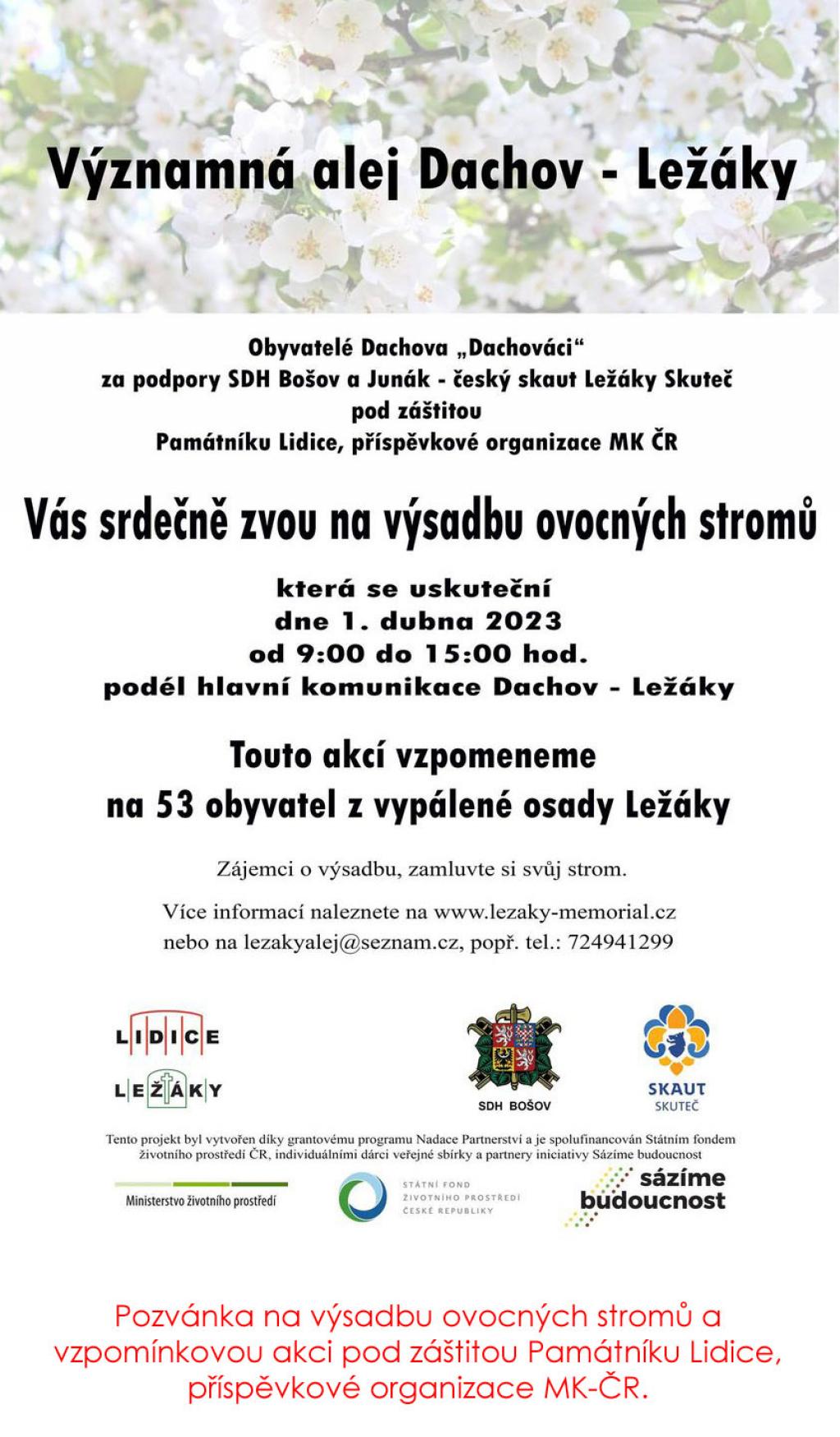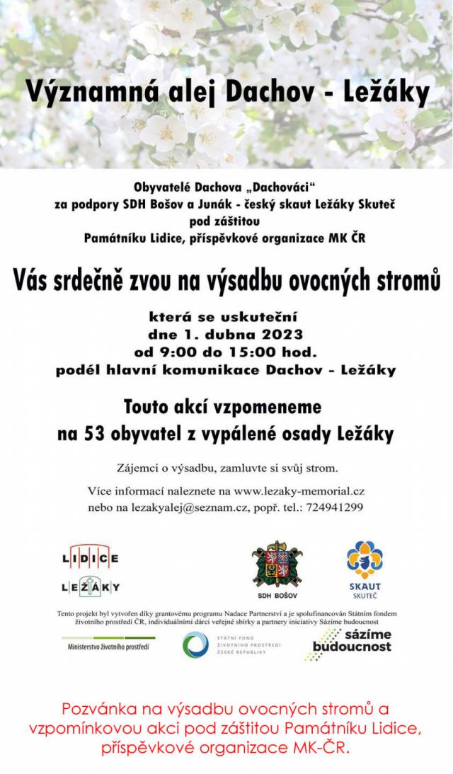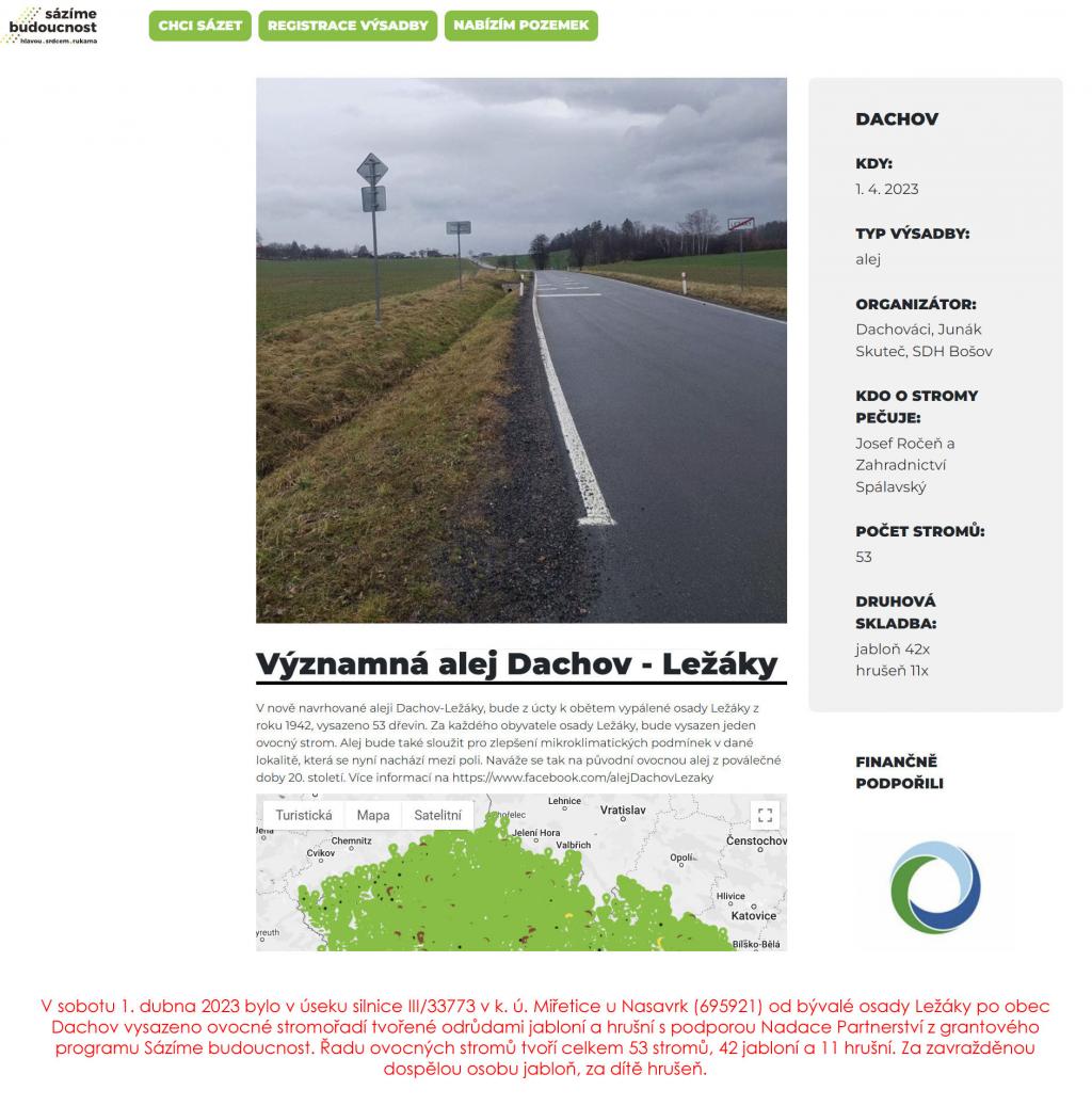 poli. https://www.sazimebudoucnost.cz/cs/akce/Vyznamna-alej-Dachov-Lezaky-(1) Nahradí 53 mladých ovocných stromů mikroklima 10ha
