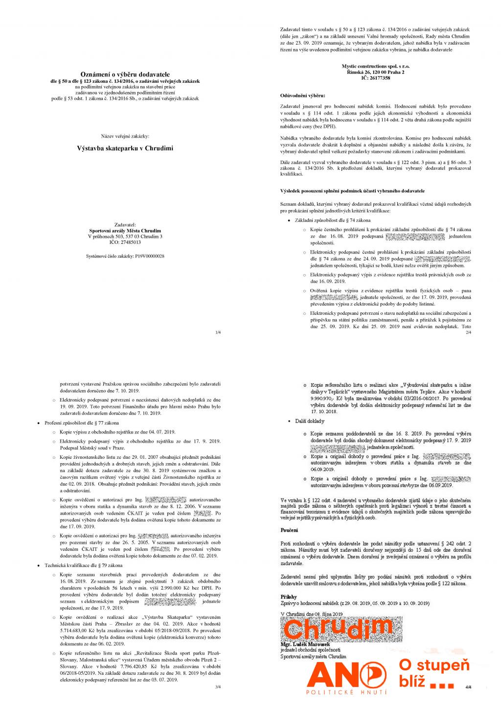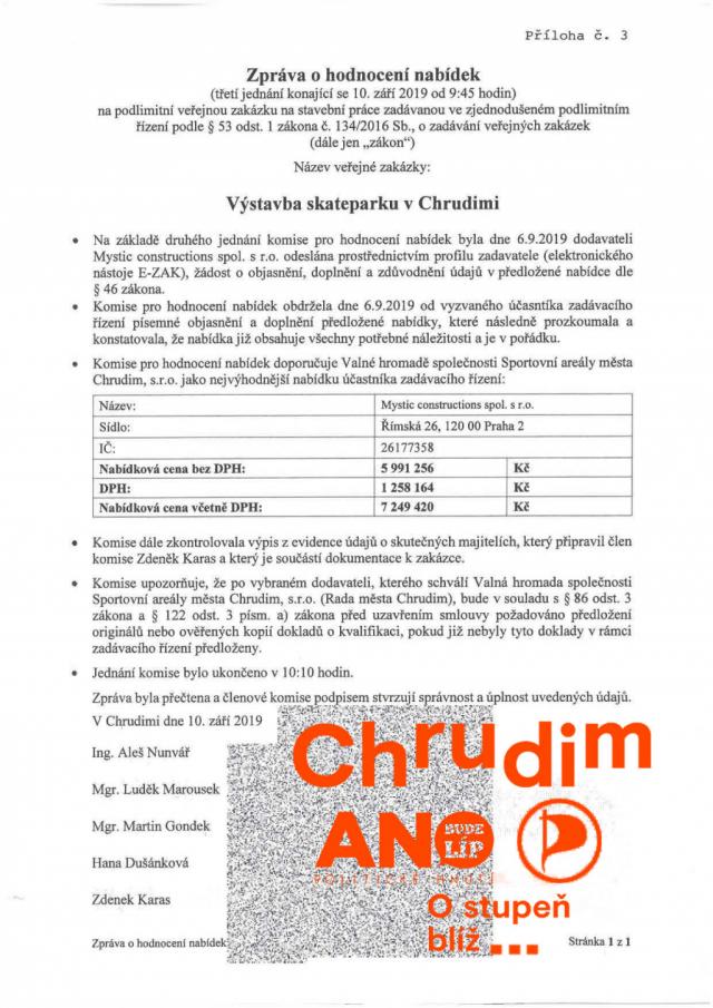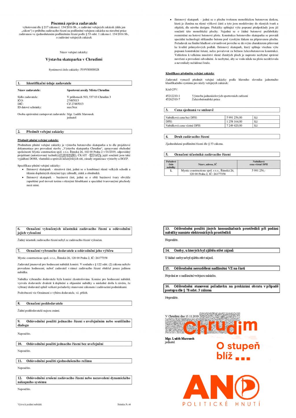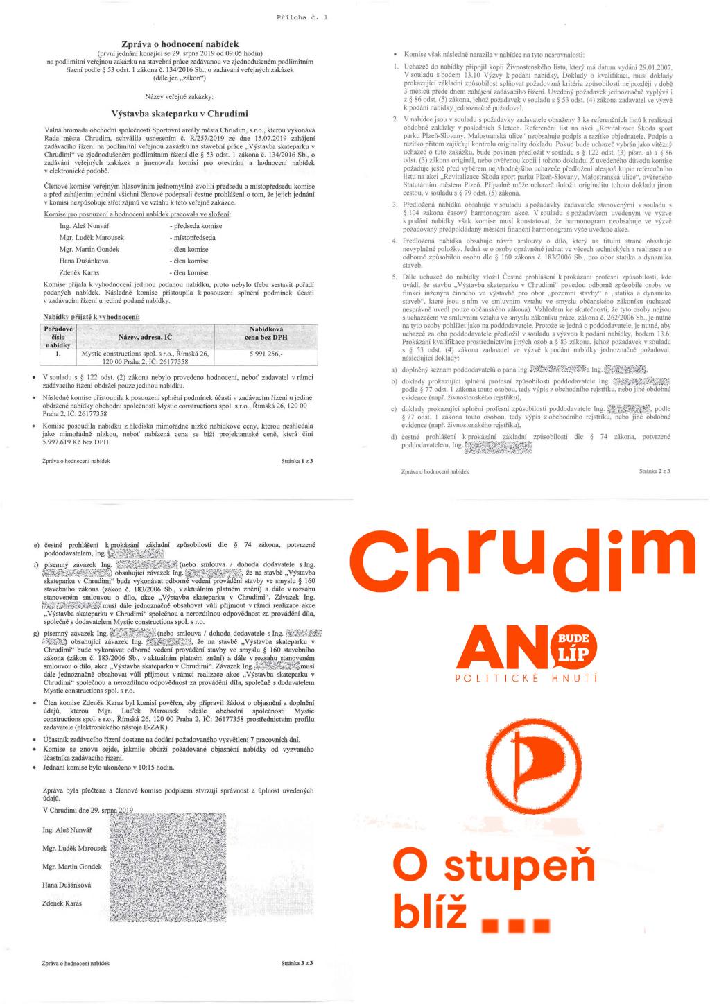 Chrudimský skatepark je klasickou klientelistickou veřejnou zakázkou. Mladé lidi tento rozměr vzniku staveb a veřejného prostranství města zatím nezajímá. Mají sportoviště pro skateboard, BMX kola, koloběžky, in-line brusle . . . . a to jim stačí. Jde o veřejný prostor, a tak si ukážeme, jak probíhá jeho tvorba a opakující se praktiky vedení. CHAPTER No. 1 – UPGRADE IRON/CONCRETE Byl rok 2003. Firma Mystic vytvořila pro město v roce 2003 montovaný skatepark za zimním stadionem. Před rokem 2018 začal dožívat. Byl skupinou politiků a lidí posunut na prvořadou prioritu všech obyvatel, za prioritu rozvoje města, architektury, výstavby a za téměř nejdůležitější věc ve městě. Bylo nutno vytvořit veřejné zakázky připomínající upgrade office software. Přiblížíme si jak tento “NÁHODNÝ“ sled veřejných zakázek na upgrade montovaného skateparku na vyšší betonovou verzi vypadá. A jak vypadá boj představitelů města proti klientelismu. Nutno předeslat, že jde o finančně malou veřejnou zakázku na veřejný prostor města. CHAPTER No. 2 – MAYOR PETER Psal se únor roku 2018 a bylo nutno připravit veřejnou zakázku na projekt. Už od teďka typujete určitě správně. Smlouva byla opětně podepsána s firmou Mystic Construktions s.r.o., která už předtím zpracovala studii skateparku. Tehdejší starosta města podepsal smlouvu v ceně 141 500 CZK (bez DPH) na projektovou dokumentaci pro vydání územního rozhodnutí, stavebního povolení a pro provedení stavby a výběr dodavatele s názvem: „Výstavba skateparku, Chrudim.“ Předání kompletního projektu pro realizaci stavby bylo smluvně stanoveno na 31. 8. 2018. Jednoduchý projekt ve stupni DPS nese datum leden 2019. Už v tuto chvíli mohl být třeba vybrán dodavatel stavby a nemusel být placen několikrát. Nemusela být rozehrána následující trapná šaškárna spojená s vnímáním české legislativy, zadáváním veřejných zakázek a především s neskutečným politickým alibismem, který stejně jako v tomto případě vede akorát k veřejně dokladovatelnému klientelismu. Od této chvíle, tedy od února 2018, jsou rovněž zbytečně placeni politici, jejich komise, úředníci, kteří se skateparkem zabývali a mohli se věnovat užitečnějším věcem. CHAPTER No. 3 – NEW MANAGEMENT / NEW TOWN HALL / NEW GOVERNMENT Dne 12. srpna 2019 bylo zahájeno zadávací řízení na výstavbu skateparku v Chrudimi. Zadavatelem byly Sportovní areály Města Chrudim. Notičky převzala nová radnice. Předpokládaná hodnota zakázky s přesností koruny = 5 997 619 CZK (bez DPH). V přiloženém rozpočtu zpracovatele projektu je uvedena cena 5 991 256 CZK (bez DPH). A kdo bude vítězem? Kdopak to postaví? Opět můžete všichni tipovat. CHAPTER No. 4 – DONUTS AND PIRATES Slavná komise města pro posouzení a hodnocení nabídek veřejné zakázky Výstavba skateparku v Chrudimi měla plné ruce práce. Komise přijala k vyhodnocení jedinou podanou nabídku. Pořadí nabídek netřeba ani sestavovat. Byla přijata nabídka firmy Mystic Construktions s.r.o. s nabídkovou cenou 5 991 256 CZK (bez DPH), která je uvedena i v rozpočtu k prováděcí projektové dokumentaci. Zpráva o hodnocení nabídek z 29. srpna 2019 řeší formální nesmysly. Následně je řeší komise 5. září 2019. Komise 10. září 2019 doporučuje Valné hromadě společnosti Sportovní areály města Chrudim s.r.o. jako nejvýhodnější nabídku účastníka zadávacího řízení Mystic Constructions s.r.o. v hodnotě 5 991 256 CZK (bez DPH). Po usilovné práci dne 8. října 2019 mohl zadavatel - Sportovní areály Města Chrudim oznámit světu výběr dodavatele výstavby skateparku v Chrudimi, kterým se nestal nikdo jiný, než firma: MYSTIC CONSTRUCTIONS spol. s r.o. Smlouva o dílo “Výstavba skateparku Chrudim“ s firmou Mystic Constructions spol. s r.o. v hodnotě 5 991 256 CZK (bez DPH) byla podepsána objednatelem - Sportovními areály města Chrudim 30. října 2019. Komedie veřejné zakázky v režii Pirátů a ANO postoupila k realizaci. Ze dne 15. listopadu 2019 pochází Písemná zpráva zadavatele o veřejné zakázce: Výstavba skateparku v Chrudimi. Mj. se v předmětu plnění veřejné zakázky můžeme dovědět novinku, že: „Předmětem plnění veřejné zakázky je výstavba betonového skateparku a to dle projektové dokumentace pro provedení stavby „Výstavba skateparku Chrudim“, zpracované obchodní společností Mystic construction spol. s r.o“. Dne 17 července roku 2020 byl ještě podepsán vcelku humorný dodatek smlouvy u dílo, týkající se méněprací a víceprací. Skatepark byl otevřen v září roku 2020. CHAPTER No. 5 – NEW BEGINNING ? Levicově komunistická firma ANO-fert a svazácká organizace Pirátů si vyzkoušela ve městě jak na to. Od té doby dokončila špatný a klientelistický projekt terminálu, který krom celé řady věcí ani nedokázal řešit potenciál a potřeby rozvoje území a tohoto chrudimského brownfieldu. Dokončila sjezd na nábřeží ke sportovištím, kde se to korupčními a klientelistickými projekty jen hemží. Stačí připomenout novou sportovní halu nebo to, jak vznikala studie sjezdu a jak hloupý je to projekt po stránce toho, co nedomyslel – co měl řešit a neřešil. Klientelisticky zadaným projektem parkoviště zničila venkovní prostor sportoviště za Sokolovnou. V rámci areálu Sokola následně zadala projekt na zakázku stavby v hodnotě přes 150 000 000 CZK z ruky. V roce 2020 nechala zpracovat klientelistický projekt Zastavovací studie parkovacích domů – Chrudim. Jde o nejhorší projekt v novodobé historii města po roce 1989, který zároveň svým uvažováním do tohoto roku také patří a měl by v minulosti zůstat. PŘIPOMENUTÍ CHRUDIMSKÉHO KNOW-HOW: - Skatepark zapadá do tzv.