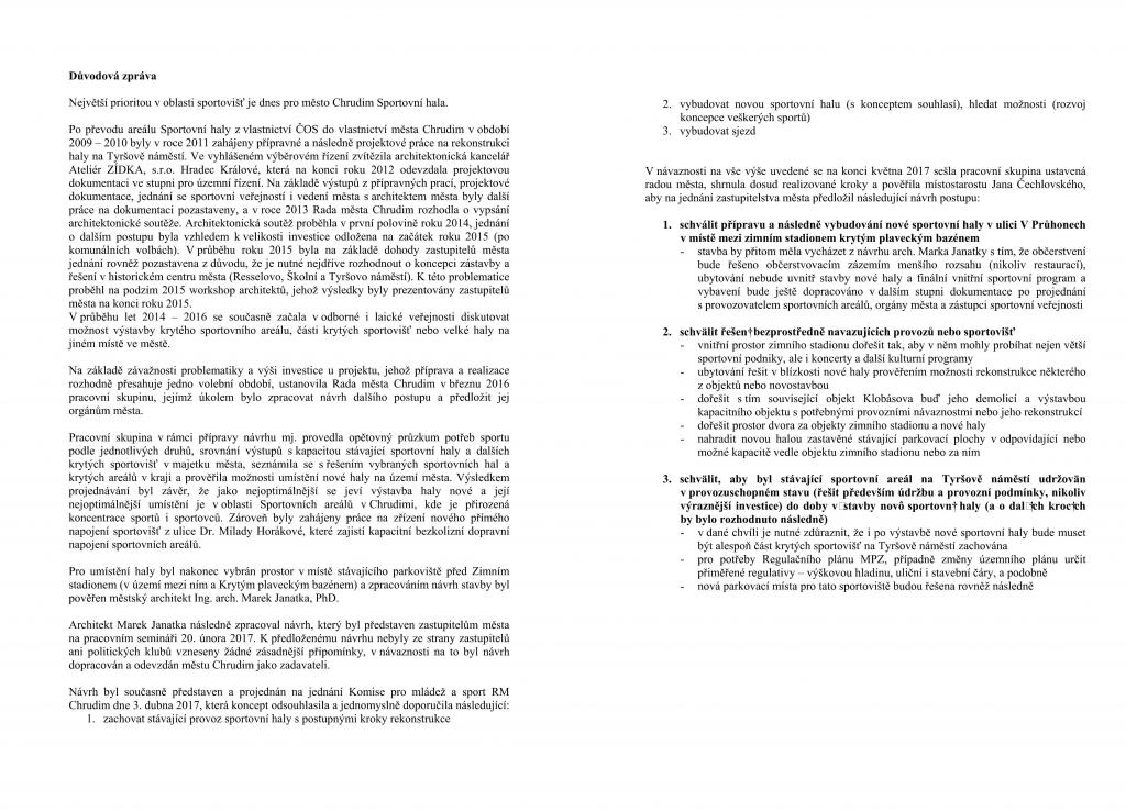 Ještě jednou se vracím v několika bodech ke sportovní hale. 1. Místostarosta pan Čechlovský, ať už vědomě či nevědomě lidem lže. (viz. http://www.chrudim.eu/sportovni-hala-v-nbsp-chrudimi/d-7344 ) Jde o projektovou dokumentaci na úrovni studie. Projektová dokumentace nese název “NÁVRH STAVBY – SPORTOVNÍ HALA CHRUDIM“ (03/2017). Studie, jak je zde uvedeno, řeší novostavbu Sportovní haly Chrudim v ulici v Průhonech! Studie řeší novostavbu haly v podrobnosti návrhu stavby! Cílem je ideový návrh vhodného materiálového a konstrukčního řešení objektu. Popsána je koncepce navrhovaného konstrukčního řešení atd., atd. 2. “NÁVRH STAVBY SPORTOVNÍ HALA CHRUDIM“ má řadu nedostatků a je zpracován neprofesionálně. Neřeší a nezahrnuje vůbec širší vztahy. Je zde pouze odkaz, že buď jsou, nebo budou nějak řešeny. Tedy ohromné množství souvisejících problémů není vůbec řešeno. Celou řadou problémů trpí dlouhá léta areály sportovišť, nábřeží a celé území města prakticky od ulice Vrchlického až daleko za ulici Dr. Milady Horákové. O zničeném nábřeží a ulicích U Stadionu a V Prhůhonech ani nemluvě. Jako správný architekt neřeší Janatka tyto vztahy buď raděj vůbec, nebo schematicky, tedy nezodpovědně. O dopravě a dopravě v klidu taky raději nemluvím. Stejně tak inspirace halami (Svitavy, Litomyšl, Skuteč) se týká jen a pouze architektury, protože baráky jsou zasazeny vesměs do úplně jiného urbanistického prostředí měst. Sportoviště u řeky Chrudimky je osobité, a aniž se někdo zamyslí nad zlepšením jeho celkové podoby a fungování a zlepšením této části města, vypleskne a přilepí někam barák jak z katalogu. Kdo jiný, by to měl před umístěním stavby řešit? Svědčí to o nízké úrovni českých architektů? 3. Chybí odpovídající informovanost. Téma návrhu sportovní haly není zanedbatelné. Ani o tomto důležitém tématu město veřejnost neinformuje odpovídajícím způsobem. Kde projekt a dění kolem něj najdu na novém webu města? Pominu-li uveřejněné PODKLADY k 20. zasedání Zastupitelstva města Chrudim konaného dne 19. 6. 2017, lze informace těžko dohledat. Třeba se toulají ve změti odkazů někde zde: http://www.chrudim.eu/dokumenty/ds-1103/p1=1674. Naštěstí o sportovní hale psala jiná média, deníky, opakovaně i Chrudismké noviny. (např: http://chrudimskenoviny.cz/kategorie/postrehy/jakub-valenta-sportovni-hala; http://chrudimskenoviny.cz/kategorie/politika/zastupitelstvo-predprazdninove; http://chrudimskenoviny.cz/kategorie/zpravy/radnice-chce-postavit-novou-sportovni-halu. Informuje někde pan Janatka veřejnost o tom, co vůbec pro město Chrudim dělá? Ne, informují opět jiní (např.: http://chrudimskenoviny.cz/kategorie/zpravy/mestsky-architekt-marek-janatka-bude-nove-za-svou-praci-pro-mesto-dostavat-tri-sta-). 4. Jak bylo zmíněno v předešlém příspěvku. Město nevyvodilo odpovědnost za špatnou soutěž na Sportovní centrum Chrudim/ 2014. Katalog pochybené a zpackané soutěže zde: http://www.chrudim.eu/architektonicke-souteze/d-1753/p1=1674. 5. Kolik stál projekt sportovní haly? Lidé se z komentáře pana Čechlovského nedozvěděli, jestli město zaplatilo projektantovi, který je zároveň hlavním architektem města za projektovou dokumentaci. Pokud ano, jde o střed zájmů a mělo by to být řešeno. Pokud to pan Janatka udělal pro město zdarma, je to v pořádku a nelze to než kvitovat. To se týká i jiných potenciálních projektů, zpracovávaných hlavním architektem pro město. 6. Proč město zadalo Janatkovi projekt? Stále chybí srovnání, chybí jiná, kvalitnější a lepší řešení. Navíc, jak bylo řečeno výše, v odpovídajících souvislostech. Zatím má Chrudim, dle zpráv medií, k dispozici návrh pana Herbsta a návrh pana Janatky. Jde tedy pouze o jeden ze dvou uveřejněných názorů na budoucnost sportu ve městě. Veřejnost by od politiků či hlavního architekta měla být od počátku seznámena s transparentními a odpovídajícími postupy, které doprovázejí úvahy a zadání podobně významných staveb. 7. Hlavní architekt ukázal lidem ve městě, jak přesně nemá vypadat jeho úloha. Město by mělo zvážit využívání jeho služeb. Hlavní architekt by měl být spíš odborný koordinátor a moderátor široké politické, odborné i laické veřejné diskuze o nalezení optimálního místa a podoby nové sportovní haly města, včetně nalezení optimálních kroků a postupů, které povedou k návrhu a výstavbě. Svým krokem řekl lidem ve městě pouze to, že ostatní jsou blbci a že to udělá raději sám. CO ŘÍCI ZÁVĚREM? Politici lidem lžou, minimálně se zamotávají do svých polopravd. Hlavní architekt nesplnil svou úlohu a mělo by to se vší vážností být řešeno. Lidé volí politiky, a tak vyhodit nejdou, lze je pouze nevolit. Hlavního architekta volí politici a vyhodit jde. Nikdo se zatím neobtěžoval veřejnost seznámit s projektovou dokumentací pana Janatky. “NÁVRH STAVBY – SPORTOVNÍ HALA CHRUDIM“. V obrazové příloze je uvedena projektová dokumentace, tak jak byla uvedena v PODKLADECH k 20. zasedání Zastupitelstva města Chrudim konaného dne 19. 6. 2017. odkaz na předchozí článek: