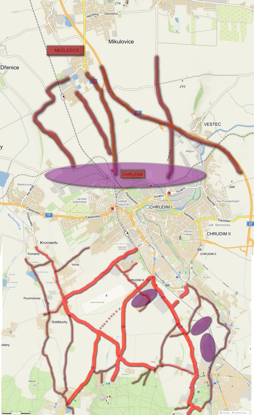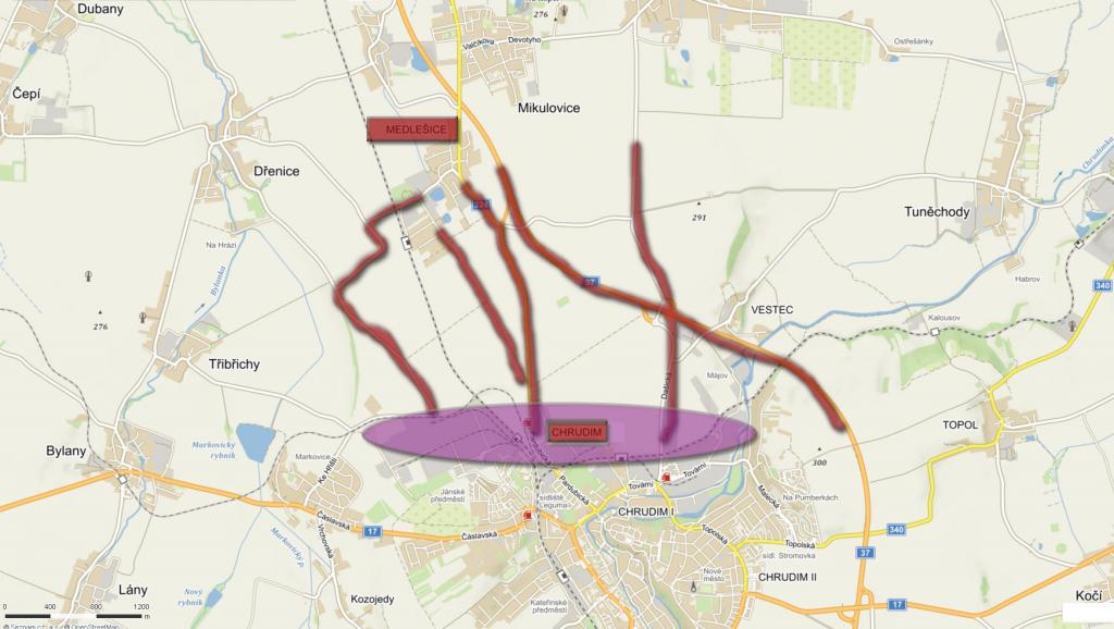 přeložky od Medlešic do Chrudimi, stejně jako stávající řešení dopravy v