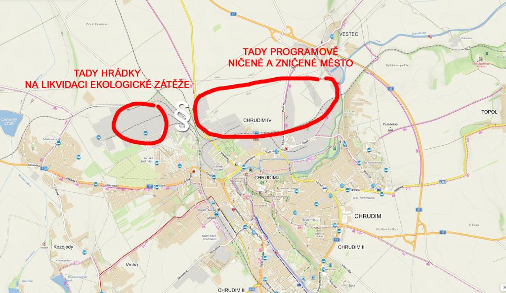 městskou čtyřletku v oblasti životního prostředí. ps: Pardubický kraj vlastní a Správa a údržba silnic Pardubického kraje hospodaří v areálu naproti skládce, který je vymezen ulicemi V Malecku a K Májovu. (arál Cestmistrovství – Tovární ul. 1 150, 537 83 Chrudim, parc. č.: 601/2, kú: Chrudim - 654299). Těžko říci, jak to člověk má v roce 2015 vnímat. Je hospodaření kraje s podporou města návodem pro všechny ostatní lidi? Když vám nestačí jeden pozemek, opatřete si s požehnáním města jiný. Dobré místo je u vody, nejlepší pak třeba přímo na ostrově. Pozemky pak můžete využít pro soukromou skládku. Tohle opravdu není příklad pro napodobování, možná už jen proto, že by ve městě nešlo bydlet.
