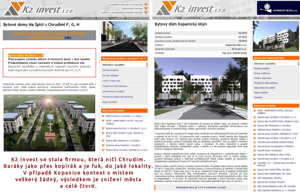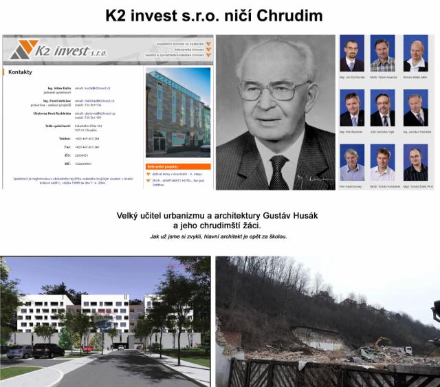 v Chrudimi připomíná éru Gustáva Husáka Stavět ve městě ano, ale lépe! Kultura stavění je v Chrudimi otřesná. Dnešní stavění připomíná totalitu a éru Gustáva Husáka, kdy asanačnímu teroru a běsnění podlehla mnohasetletá stavební historie města, byly vymazány celé bloky, zdemolovány a nenávratně zničeny celé čtvrti a ulice města a byly vytvořeny bezprizorní prostory, s kterými si dodnes město neví rady. Dnes za oběť stavebnímu běsnění padla Kopanice, zítra to může být něco jiného. Rezidence Kopanický mlýn je pouze ukázkou nekvalitní a bezohledné zástavby v centru města, nerespektující okolní území. Budoucí majitelé 126 bytů možná bydlení ocení a budou volit stávající dinosaury, řada místních se však na stavbu bude dívat jako na stavební vřed, kterým si pan Kušta se svým radničním týmem zbytečně znepřátelil řadu zdejších obyvatel. Vypadá to, že dnešní developeři a jejich radnice je na úrovni Husákových komoušů. Stavět se dá jinak a lépe, bohužel se lidé musí smířit s tím, že žijí v Chrudimi a tady to zatím nejde. Tohle lokalita není bohužel stejná, jako např. pro bytový dům v Husově ul. v Pardubicích, kde autorem zástavby je rovněž arch. Kozub. Stejně tak se nejedná o lokalitu Na Špici v Chrudimi, která vznikla na poli! Jen debilní architekt se stejně inteligentním developerem může mastit baráky jako přes kopírák. Jen debilnímu tandemu může být fuk, kde a v jaké lokalitě baráky mastí. Pane Kozub! Kopanice není to samé jako stavět na poli kolem Chrudimi, Kopanice a zbořený mlýn nejsou Pardubice! Ať si ČKA dává na tohohle urbanisticko-architektonického teroristu bacha! http://www.kopanickymlyn.cz/ Nejde pouze o dopravu Leták je jednostranně orientován na dopravu. Doprava je pouze jen jedním z problémů, který doprovází nevhodnou zástavbu a celý záměr. Takto rozsáhlý záměr měl být rovněž posuzován v souvislostech všech jeho etap, tedy jeho konečné podoby. Bytový komplex bude zahrnovat 126 bytových jednotek. Pro představu - celá ulice Sv. Čecha dlouhá kolem půl kilometru nemá ani sto domů. Vítejte v realitě. Do obludného baráku se mohou klidně sestěhovat všechny rodiny a všichni obyvatelé z ulice Sv. Čecha i z několika přilehlých ulic. Až tam budou bydlet, mohou nechat své domy také srovnat se zemí a poprosit pana Kuštu, aby na jejich místě postavil stejně úžasné bytové domy pro nové sousedy, kterým se už dneska neříká paneláky, protože mají na betonové kostře vyzděné obvodové zdivo. Vyhoďte už konečně