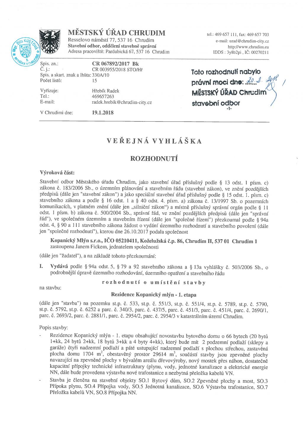 Chrudim Pro nejasnosti kolem stavby “Rezidence Kopanický mlýn“ jsem si vyžádal sdělení od Stavebního odboru MěÚ Chrudim podle zákona č. 106/1999 Sb, o svobodném přístupu k informacím. Dne 8. 11. 2017 mi bylo sděleno, že stavební úřad vydal 27. 6. 2017 rozhodnutí, kterým povolil odstranění mlýna a ostatních objektů mimo trafostanice v areálu bývalé dýhárny. Dále mi bylo sděleno, že Stavební odbor MěÚ chrudim obdržel dne 26. 10. 2017 žádost o vydání společného územního rozhodnutí a stavebního povolení na stavbu “Rezidence Kopanický mlýn“ – I. Etapa. Dnem podání žádosti bylo řízení zahájeno. Rozhodnutí nabylo právní moci 20. 2. 2018. Pokud by se chtěl člověk ve zdravém městě něco dozvědět, musel by nadužívat zákon a nedělal by pomalu nic jiného, než se dotazoval po informacích, které radnice záměrně tají. Město jako vlastník, tedy rada města, vydala rovněž souhlas s demolicí mlýna a se stavbou bytového domu. (Město Chrudim, Rada města Chrudim, USNESENÍ R/175/2017 ze dne 24. 4. 2017, Souhlas s odstraněním staveb Koželužská 86, Chrudim II (Trávníček, Řezníček), předložil: Milan Havelka, OSM; Město Chrudim, Rada města Chrudim, USNESENÍ, R/443/2017, ze dne 16.10.2017, Souhlas se stavbou "Rezidence Kopanický mlýn" a se zřízením věcných břemen, (Trávníček, Řezníček), předložil: Milan Havelka, OSM) V sérii článků věnovaných tomuto problému jsou tyto informace zveřejněny (viz. odkazy níže) Lze se jen tázat, jestli politici za takový přístup k devastaci města a svého okolí něco berou, nebo jsou už tak pitomí, že neberou tihle chrudimští patrioti nic. Úředníci stavebního odboru na objednávku politiků zpečetili dne 20. 2. 2018 osud Kopanice a Kateřiny. Politickou objednávku vyřídil pan Radek Hřebík. Selhání města Bylo upozorněno na porušení územního plánu města a na jeho účelový vyklad. Stavba není v souladu s územním plánem a jeho regulačními podmínkami pro území. Každý má právo si zdemolovat to své a na svém si postavit lepší. Lidé změnili podobu domů na Kateřině, řada z nich byla stavebně zničena, řada fasád neunikla polystyrenizaci. Ještě hůř dopadla Kopanice. Zájem úředníků a politiků o podobu města končí ve stupidní památkové zóně. Český způsob o rozvoj města, krajiny a vůbec prostředí kolem nás je ochranářsky selektivní a velice nešťastný. Tady chráníme, vedle ničíme. Asi je něco někde špatně. Rovněž něco jiného je, když si člověk zničí domek a něco jiného je, když se jiný rozhodně zničit kus území města. Tenhle záměr negativně ovlivní celou městskou čtvrť! Nízká stavební kultura Odborníci z radnice nám projektují město. Město rozežírá nízká stavební kultura podporovaná nezodpovědným rozhodováním politiků. Kauza “Parkoviště“ a Masarykovo náměstí je průser, z kterého se politici dnes po řadě let snaží vybruslit. Pokud se veřejnost nebude zajímat o nábřeží Chrudimky U Stadionu, zničí politici i to. Podobně velké problematické stavební záměry se v otevřené demokratické společnosti a v demokratických městech světa řeší s veřejností. Je vcelku jedno, zda jde o stavební a developerské záměry města či záměry soukromé. Tento institut v Chrudimi neustále selhává. Lidé by neměli doplácet na špatné záměry. Místo nalezení kvalitního řešení pro rozvoj této lokality Kuštův radniční tým podepsal s vyloučením obyvatel její urbanistickou likvidaci a ještě lidem lže. Obnovu baráku v centru města svede zkušenější firma, jenže politici naprosto selhali při plánování města. Kdo jiný by měl hájit zájmy místních obyvatel a voličů, než oni? Proč chrudimští politici zcela neinformují o takto důležitých záměrech veřejnost? Proč jim stále unikají souvislosti a dopady podobných rozhodnutí? Jde o naprosté selhání rozvoje města v této lokalitě. Stavění