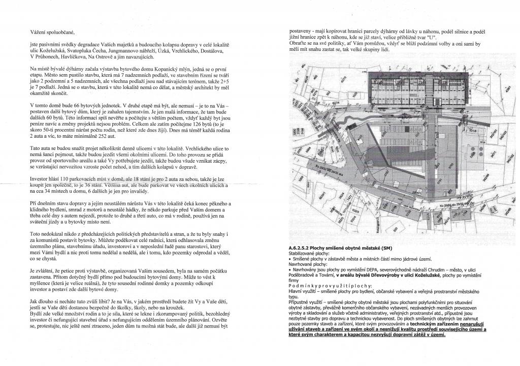 Jsme v éře stavění Gustáva Husáka? Městská čtvrť bude zničena a nezbývá, než se s ní rozloučit. Chrudimští politici mají další zásluhy o rozvoj zdravého město. Došlo k selhání politiků a hlavního architekta? Musí město a jeho obyvatelé trpět nekvalitní zástavbu a zničení další městské čtvrti? Musí obyvatelé trpět další devastaci životního prostoru kolem sebe? Musí přihlížet tomu, jak jim část města díky politikům mizí před očima? Proč Kuštův radniční tým zničil Kopanici? Kopanický mlýn