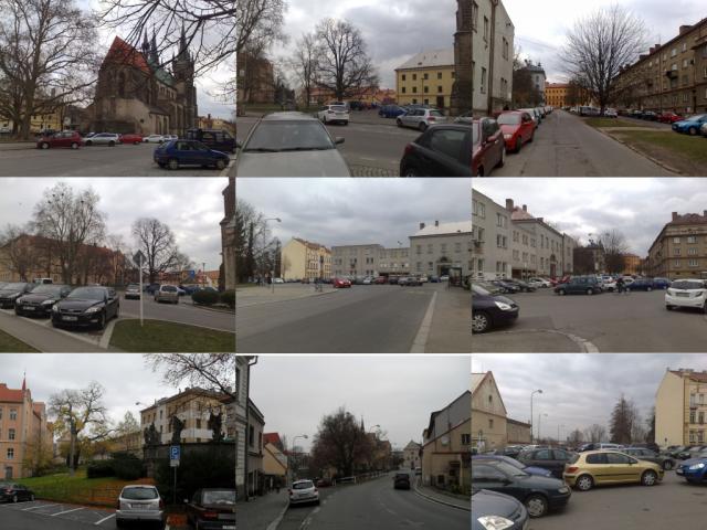 v asanačních prolukách Když se z města vytratily staré městské čtvrti a staré uliční zástavby, zbylo tu dědictví asanací. Zbyl tu zničený a neživotný městský parter, bezprizorní volné veřejné plochy obsadila trapně upravená zeleň a především parkoviště. Stačí se podívat, jak to třeba vypadá kolem Resselova náměstí a na Kateřinském předměstí. Město je v těchto částech doslova prošpikováno ploškami a plochami parkovišť. Stoupají v jeho centru od kostela vzhůru. Plochami pro auta je ověšena celá dopravní stoka od Penny, přes Borznu, Masarykovo náměstí k Lidlu. Dál pokračuje rozpad města navazující na tuto městskou dopravní stoku. “Vybombardované“ prostory původní uliční zástavby, asanace a proluky nahradila veřejná prostranství, která jsou dneska plná aut, místo “města“. Ani po letech se město, jeho zástavba a příjemný život do těchto končin nevrátil. Parkování v dnešní