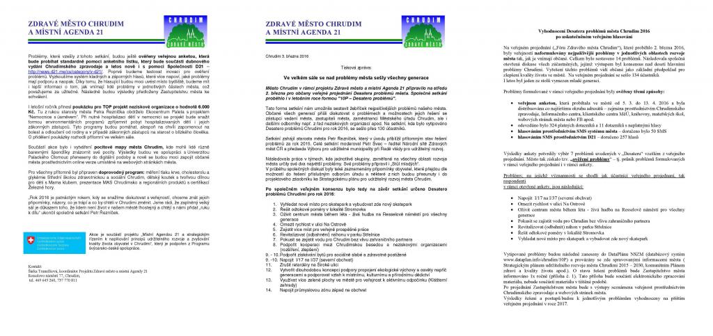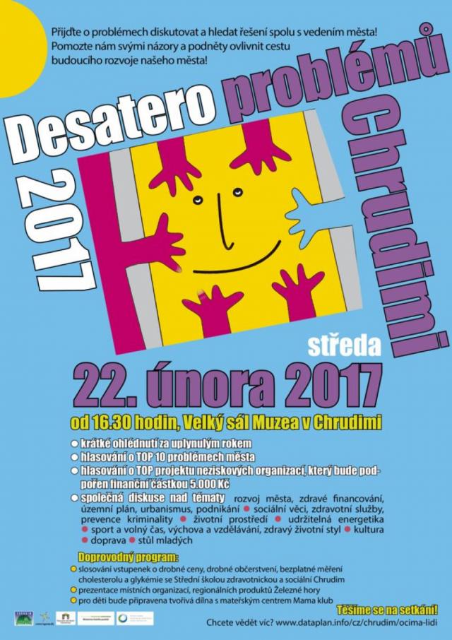 Vzájemná spolupráce politiků a jejich voličů, odborné i laické veřejnosti na lepší podobě města a života v něm, vzájemná spolupráce všech obyvatel, či společné utváření města ve vzájemné společenské shodě bez egoistických zájmů a jednostranných hledisek byznysu a podnikání je pro budování každého města a jeho krajiny zásadní. Úspěch už může být jen to, pokud se egoistické zájmy a jednostranný byznys jedné skupiny lidí podaří vyvážit či částečně přetavit všem ostatním obyvatelům a účastníkům této otevřené celospolečenské diskuze do lepší podoby města a okolí. Já osobně nerozumím tomu, co je “Zdravé město“. Chrudim i ostatní česká města jsou dle mého nemocná. Nejsem však doktor. Pokud se podíváme na města v Čechách, můžeme vidět jen velice hluboký rozpor mezi realitou - ničenou podobou měst a jejich okolí a fikcí - tím, co slovo “Zdravé město“ možná má představovat. V současnosti připomíná celé to pod záštitou státu organizované úřednicko-politické dění, vyhlašování různých cen a “lezení na bedny“ jen velmi hořkou komedii. Jak jsme informováni, Chrudim v ní hraje jednu z hlavních rolí. Protože mezi realitou a hraním si na “Zdravá města“ a na ocenění udržitelných obcí shledávám propastné rozdíly, a protože vím, že úředníci a politici z Prahy to sem mají daleko a rychloprezentace či rychlonávštěva nemá čas si všímat věcí, o kterých se nemluví, a protože se vítá zapojení veřejnosti a občanů a obyvatel do diskuze, tak jsem si dovolil, na ministerstvo poslal dopis, jak vypadá takové “Zdravé město“ očima jednoho obyvatele (http://prostorprochrudim.cz/clanek/zdrave-mesto-%E2%80%93-otevreny-dopis-ministerstvum-cr.html). Nemá cenu se bavit o problémech či lépe příležitostech města, ani o tom, jestli jich je zrovna deset. Obchvat je kompetenčně trochu někde jinde, město však ani jako správný patriot nedokázalo pořádně připomínkovat stavbu, zmírnit její důsledky a podílet se na uklizení vzniklé spoušti v krajině. Kdo to má reklamovat? Město se akorát na přání křiklounů, kteří mají jako volební a životní cíl jen své auto, zasloužilo o řešení dopravy u Medlešic, které jde proti původní filozofii obchvatu (když už tu musí megastavba být) i humanizaci dopravních stok města. Navíc tito voliči chtějí severní obchvat mezi I/17 a I/37 a protože nic jiného neznají, podporují jeden ohromný vyasfaltovaný kruhák kolem svého města. Jenže to zdejším politikům, kteří nechtějí a ani neumějí hledat lepší řešení, říkat nemusí. Projednává někdo s veřejností souběžně polidštění a obnovu města po dopravních stokách? Stejně tak šlo už dávno a bez výmluv na obchvat vyřešit nábřeží a politiky legalizovaný městský dopravní průtah, kterým se stala celá ulice Na Ostrově. Musí tudy někdo kromě lidí, co tu bydlí jezdit? Lidé si tu dávno mohli v klidu bydlet a světe div se, stačí k tomu jen pár dopravních značek, než se přistoupí k nějaké celostní obnově tohoto politiky a jejich projektanty systematicky ničeného nábřeží. Nelze rovněž každoročně schovávat neschopnost města za problémy Povodí Labe s.p. Každoročně se opakují výmluvy města na Povodí Labe s.p. týkající se odbahnění ramen řeky Chrudimky. A tak jen díky politikům čekají lidé v Chrudimi desítky let na to, až městem kolem ramen řeky jednou vůbec pěšky projdou. Těžko říct, proč před i po roce 1989 stále nejde řešit tohle letité téma. Na druhou stranu, když město zpackalo soutěž na sportovní halu a nazřelo konečně otázku sportu ve městě z nadhledu, může se odpovědně věnovat i jedné z nejpočetnějších skupin lidí ve městě. Vypadá to, že každý chrudimák je podle ankety totiž skateboardista, který potřebuje skatepark. Na odboru územního plánování města se rovněž můžete podívat na další z řady jednostranných dokumentací řešících Stromovku, na humorný projekt “Variantní dokumentace záměru Chrudim-Stromovka, řešení odtokových poměrů“, kde se lidé naučí plánovat své město podle suchých poldrů a ostatních vodohospodářských inženýrských děl. Těžko říct, jestli je to míněno vážně. Pokračovat dál se mi už ani nechce. Nikdo z dřívějších politiků a jejich voličů asi rovněž nebude zpochybňovat zásluhy zahraničního partnera na obchodování s vodou ani lidem vysvětlovat peripetie, které z toho plynou, včetně získání státních příspěvků, problematiky investic, údržby technické infrastruktury apod. Desatero úzce souvisí s veřejností a kulturou voličů. Jaká je tato kultura a jak si lidé svého města váží? Desatero a podoba města je jako zrcadlo, do kterého když se nyní podívám, místo všech těch pseudoproblémů a příležitostí maskujících opravdové problémy, vidím jen jeden velkej otazník. Přeju lidem, aby v boji s městskými mlýny a otazníky byli vytrvalí a úspěšní.