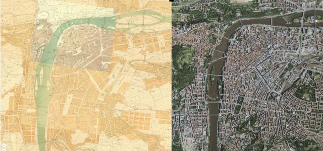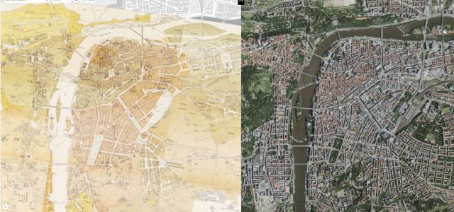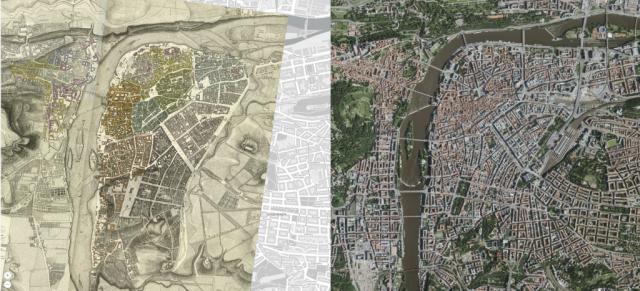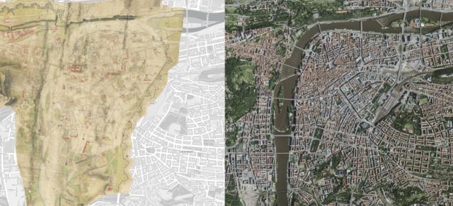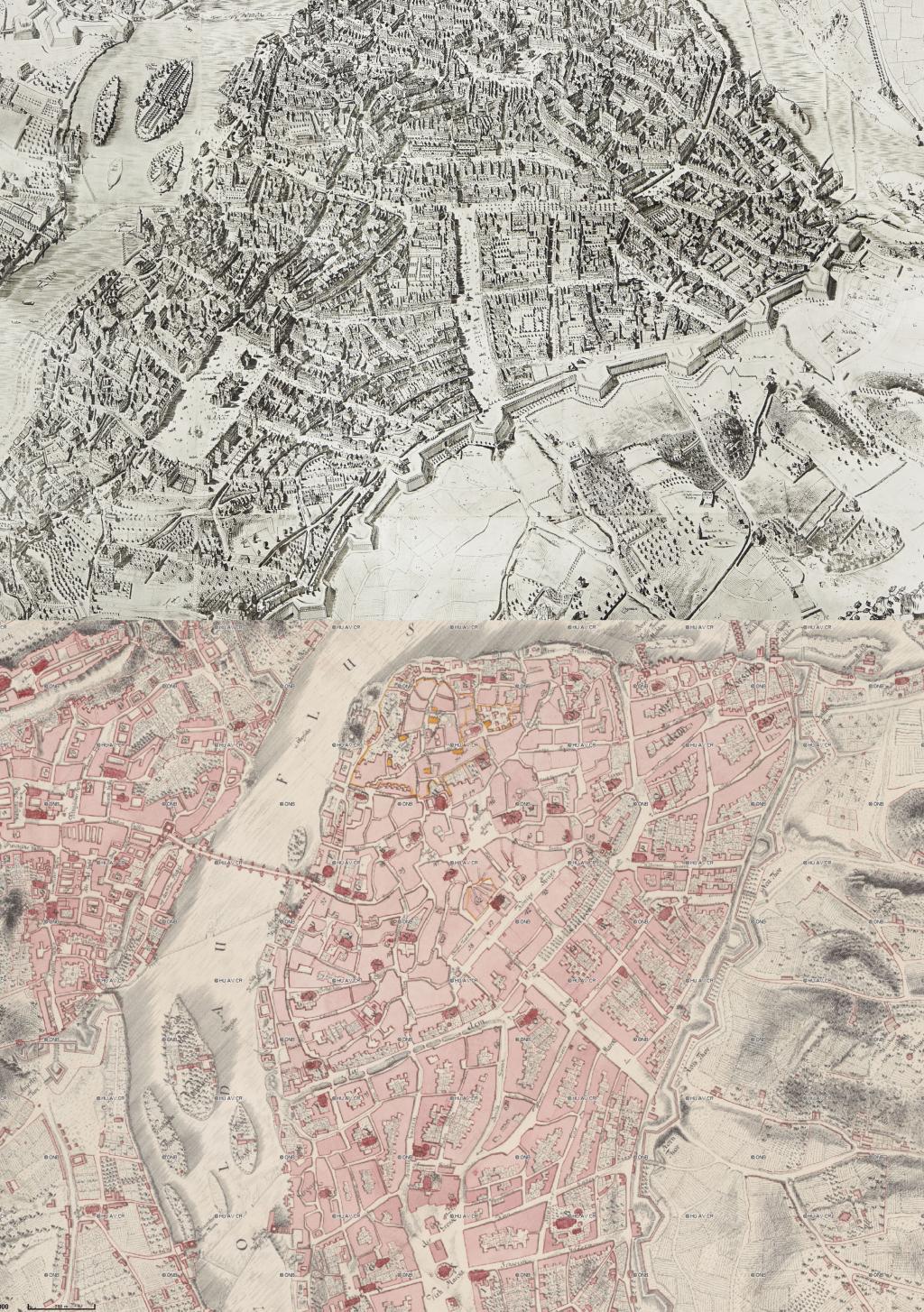 stavební strukturu města uvnitř hradem a navazující měnící se příměstskou hospodářskou,