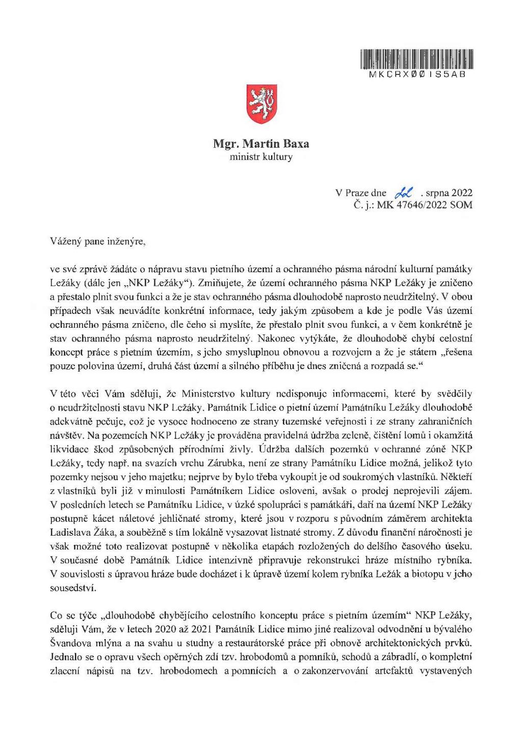 Níže odpověď na dopis Č.j. MK 47646/2022 SOM z 22. srpna 2022. Dobrý den