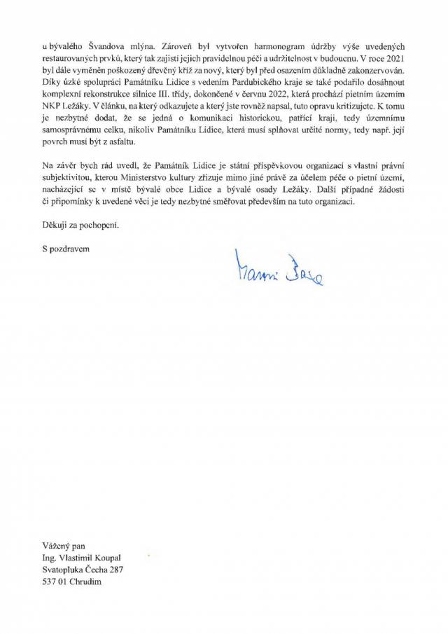 celostního konceptu práce s pietním územím“ NKP Ležáky, sděluji Vám, že v