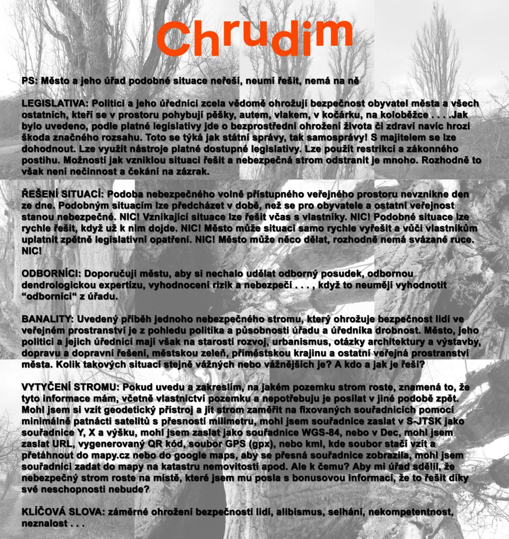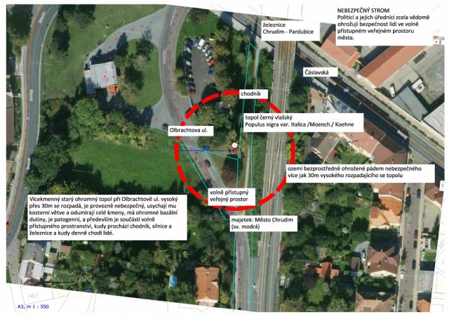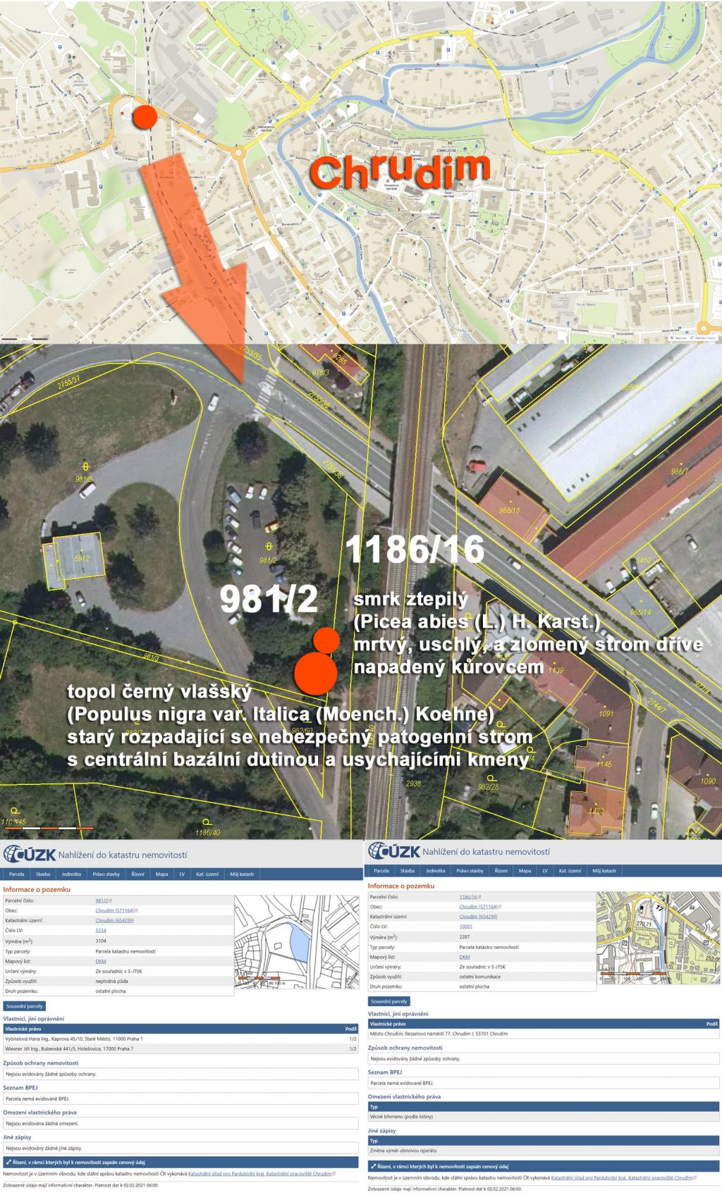 2. 2. 2021: Jaký je stav stromů na hraně volně přístupných veřejných a soukromých venkovních ploch města? Zelený veřejný prostor města často vypadá dost zoufale. Koncepce vesměs žádná. Údržba nezřídka nevyhovující. Výsadby zeleně a stromů často bez myšlenky a populistické. Stav řady soukromých a volně přístupných pozemků, které navazují na tento zanedbaný veřejný prostor ve vlastnictví města, je nezřídka podobný. Jsme mezi ulicemi Olbrachtova a Čáslavská. Nechce se ani věřit, že jsme téměř v centru města u Masarykova náměstí. Vypadá to tu jako území nikoho, ale není. Veřejně přístupné soukromé plochy tady navazují na plochy v majetku města. Topol (topol černý vlašský - Populus nigra var. Italica /Moench./ Koehne) na pozemku parc. č. 981/2, který sousedí s pozemkem města parc. č. 1186/16 je v kritickém a havarijním stavu. Vícekmenný starý topol se rozpadá, je provozně nebezpečný, usychají mu kosterní větve a odumírají celé kmeny, má ohromné bazální dutiny, je patogenní, a především je součástí volně přístupného prostranství, kudy prochází chodník, silnice a železnice a kudy denně chodí lidé. Město by mělo strom urychleně odstranit a celý prostor po dohodě s majiteli vyčistit a zkvalitnit. Dle zákona č. 114/1992 Sb. Zákon ČNR o ochraně přírody a krajiny, podle § 8 - Povolení ke kácení dřevin není k takovému zásahu nutné (odst. 4. Povolení není třeba ke kácení dřevin, je-li jejich stavem zřejmě a bezprostředně ohrožen život či zdraví nebo hrozí-li škoda značného rozsahu. Ten, kdo za těchto podmínek provede kácení, oznámí je orgánu ochrany přírody do 15 dnů od provedení kácení.) Podle vyhlášky č. 189/2013 Sb., Vyhláška o ochraně dřevin a povolování jejich kácení, je naplněn § 4 -Náležitosti žádosti o povolení kácení dřevin a o závazné stanovisko ke kácení dřevin a náležitosti oznámení o kácení dřevin, odst. 2, písmeno e) v případě kácení dřevin podle § 8 odst. 4 zákona doložení skutečností nasvědčujících tomu, že byly splněny podmínky pro tento postup. Skutečnost jsem právě doložil! Hrozí reálné nebezpečí pádu velkého přestárlého, rozpadajícího se nemocného stromu, který je reálnou hrozbou pro okolní veřejný prostor, ve kterém se denně pohybují lidé! Smrk (smrk ztepilý - Picea abies /L./ H. Karst.) kdysi rostoucí v sousedství na hranici výše uvedených pozemků byl napaden kůrovcem, dnes je uschlý, kmen se zlomil dva metry nad zemí a spadl naštěstí mezi chodník a oplocení autobazaru! V území je skládka komunálního odpadu, rostou zde nevhodné náletové dřeviny, jsou tady invazivní porosty křídlatky japonské (Reynoutria japonica)! Celý prostor postrádá dlouhodobě údržbu. Obracím se na město, aby situaci urychleně řešilo a nebezpečný topol nechalo okamžitě odstranit a celé místo vyčistit. odkazy: