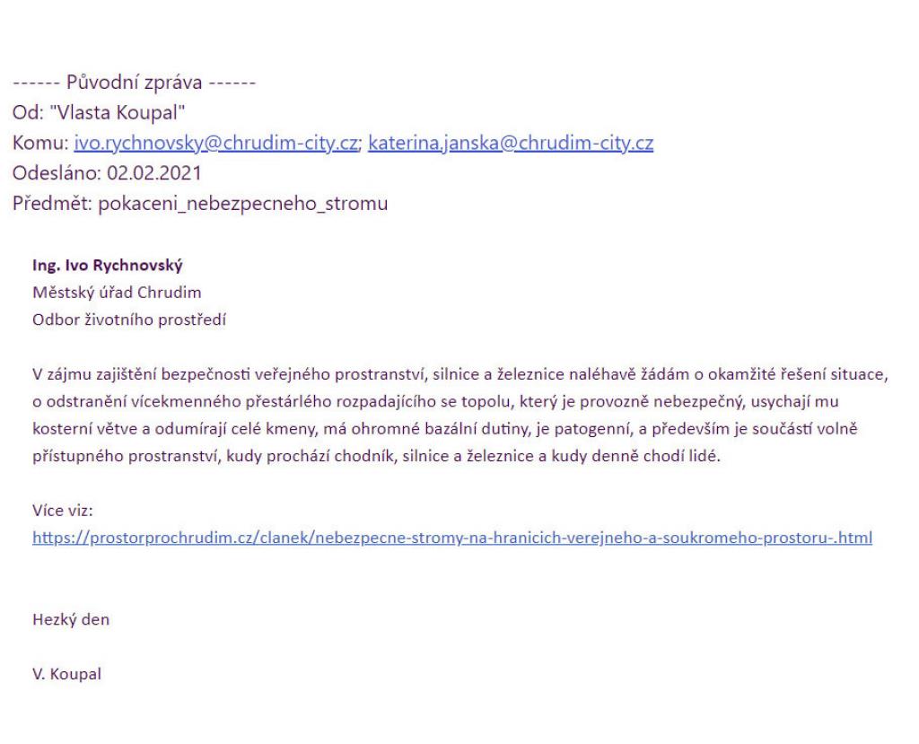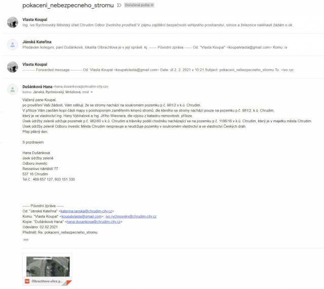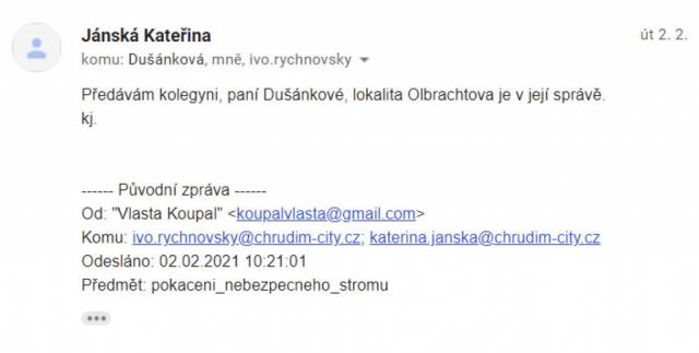 pokaceni_nebezpecneho_stromu krok třetí - A JE VYŘEŠENO . . . Dušánková Hana 2. 2. 2021 13:56 ( komu: Jánská, Rychnovský, Mrózková, Vážený pane Koupal, po prověření Vaši žádosti, Vám sděluji, že se stromy nachází na
