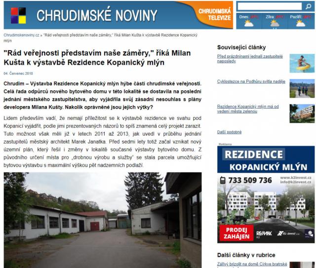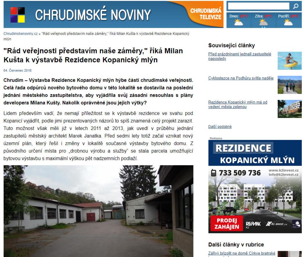 Článek si zaslouží stručný komentář, protože to, co bylo otištěno v Kuštově plátku v Chrudimských novinách je naprosto nehorázné. Co to je za kecy od hlavního architekta! Pokud to, co bylo napsáno myslí vážně, tak ho město už mělo dávno vyrazit. Ani jeden politik, ani veleslavný architekt nehájil veřejný zájem!!! Ani jeden z nich neprověřil lepší možnost zástavby, ani jeden se s veřejností v rámci přípravy záměru nebavil!!! Je fuk, že jde o soukromý projekt, protože zásadním způsobem ovlivňuje pořádný kus města. Lidé by neměli zapomenout, že Kopanici a přilehlou Kateřinu zničili radní, především pak sám Řezníček, Trávníček a slavný městský architekt Janatka. Odbor dopravy se ničím seriózním rovněž nezabýval. Slavné Zdravé město celou věc naprosto prokaučovalo, a to i proto, že podobnou věc zatím řešit nemuselo!!! (A to ani s lidmi!!!) Kecy o tom, co tu bylo předtím jsou dnes úplně mimo mísu, jsou v dnešních souvislostech naprosto nesmyslné, stejně jako srovnávat tuto výstavbu s výstavbou třeba na Špici. To může dělat jen nepoučený diletant. Ano, právě jedním z problémů je, že tuctová a hnusná výstavba jakou představuje Špic infikovala svou bezohledností dnes přímo centrum města. Za to by měl být Kozub okamžitě popotahován ČKA a pokud to neudělá hlavní architekt, měli by to udělat lidé. Jsem odpůrce podobných způsobů výstaveb ve čtvrtích obytných domků nápadně připomínající komunistické asanace a paneláky na troskách města. Navíc Janatka s Thérem dopravně nic nevyřešili. Nestaví sjezd u sportoviště, ale pouze obří kruhák, kterým zatím zničí celé nábřeží. Doprava je řešena špatně. Dochází někomu, co se děje? Radní zazdili jak krásné nábřeží, tak krásnou čtvrť. Desítky let lidé žijí díky politikům kolem hnusného a zničeného nábřeží, se silnicemi a asfaltem a s auty za zadkem, žijí kolem hnusné říční stoky připomínající kanál, a teď musí ještě sledovat, jak jim parta pitomců ničí celou městskou čtvrť. Tohle není sranda, tohle je na stíhání! Dnešní rozvoj města připomíná éru komoušů. Stejně tak kecy o čtyřech patrech. Podobně zmíněné parkování vůbec není unikátní, ale naprosto stupidní. Veřejný prostor kolem nového baráku hnusnej. Co ho tvoří, resp. bude tvořit? Parkoviště a auto! Ano, je stejně hnusnej jako třeba právě na Špici. Barák nemá čtyři, ale sedm pater! Kušta lidem kecá, ale proč to tak nevykládat buranům, když je to možné. Politici, úředníci a Kušta už lidem řeknou, jak to mají “CHÁPAT“. Jak opřít barák do svahu. Nikdo si s lepší podobou zástavby, ani s tím co tu bylo hlavu nelámal!!! Bude postaveno to nejhorší, protože Chrudim zatím nic lepšího asi nezná. Co chce dnes Kušta projednávat s veřejností??? Když má zlatokop stavební povolení a podpisy politiků, tedy i pana starosty, tak najednou prý rád představí veřejnosti své záměry. Kušta si může dnes tak akorát dělat z veřejnosti srandu. Tohle snad musí vytočit každého. To měl udělat už dávno nad prověřením lepších možností zástavby. Dnes je to pouze a jen nepřítel celé čtvrti, který přes své noviny kálí lidem na hlavu za bílého dne. Panu Valentovi nezávidím, když musí obhajovat hloupé záměry svého pána. Právě podobnými kroky si Kušta dělá z lidí nepřátele. odkazy: Chrudimské noviny: http://chrudimskenoviny.cz/kategorie/zpravy/rezidence-kopanicky-mlyn-ma-od-vedeni-mesta-zelenou iDNES.cz CHRUDIMSKÝ deník.cz