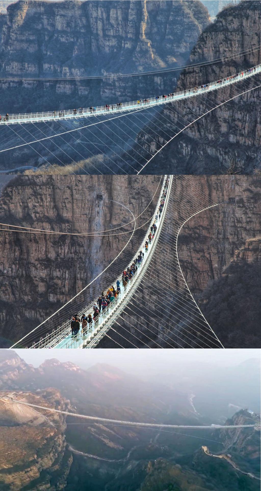 glass suspension bridge, Hongyagu Glass Footbridge, Wentangzhen, Hebei, China).
