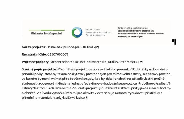 v areálu je cedulka Ministerstva životního prostředí (SFŽP-ČR) “UČÍME SE